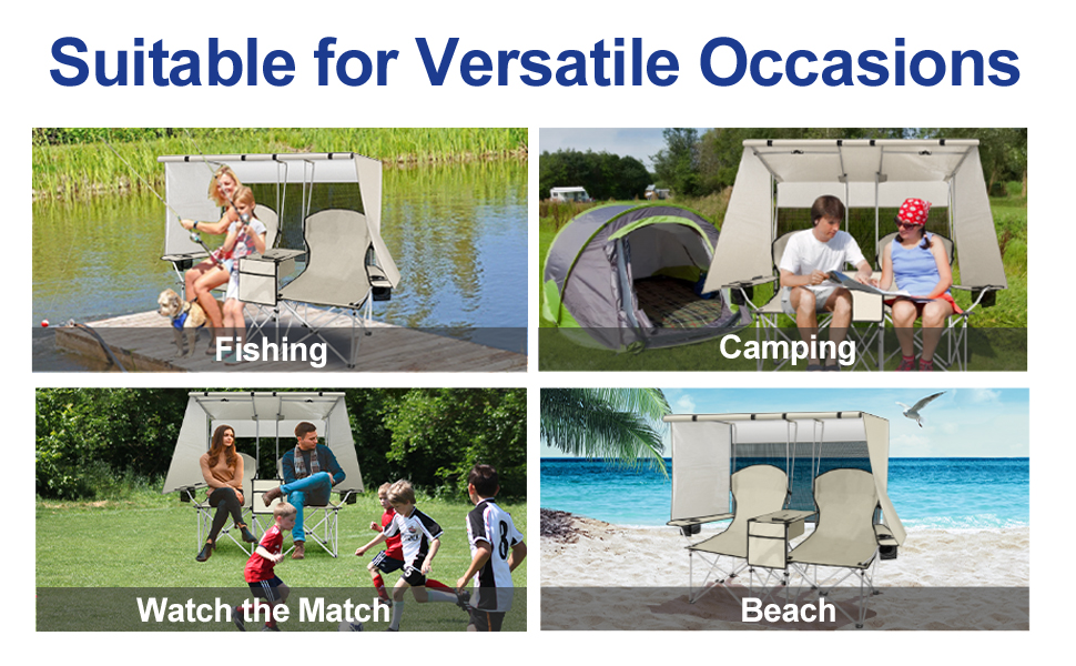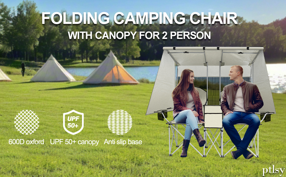 This canopy beach chair is designed for two adults and supports up to 500 lbs (227 kg). Made from durable 600D Oxford fabric with a reinforced steel frame, it provides stable and comfortable seating for camping, hiking, tailgating or relaxing at the beach.