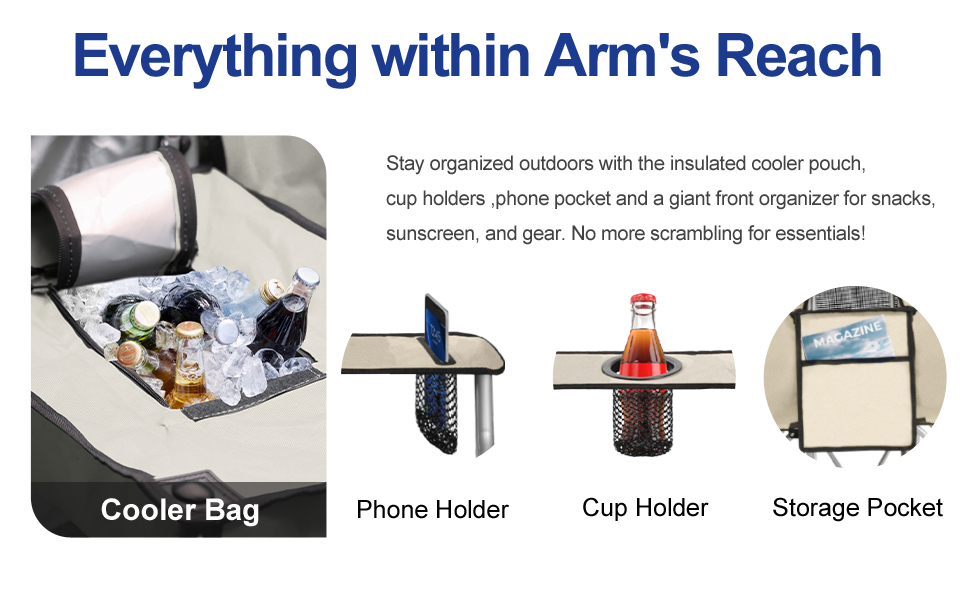 Includes an insulated cup holder, a cooler pouch, a built-in phone pocket, and a large front storage bag to keep drinks, snacks and small items within easy reach.